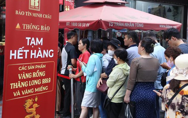 Theo ghi nhận, dù giá vàng đang cao chưa từng có và tăng "điên cuồng" không ngừng nhưng tại Bảo Tín Minh Châu (phố Trần Nhân Tông, Hà Nội) vẫn diễn ra cảnh dòng người đến xếp hàng từ sớm để chờ mua vàng, mặc dù cửa hàng đã treo biển "tạm hết hàng".