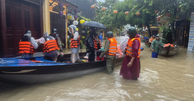 Quân khu 5 hỗ trợ đưa người dân, du khách bị mắc kẹt do nước lũ ở Hội An đến nơi an toàn. Ảnh: Trần Thường