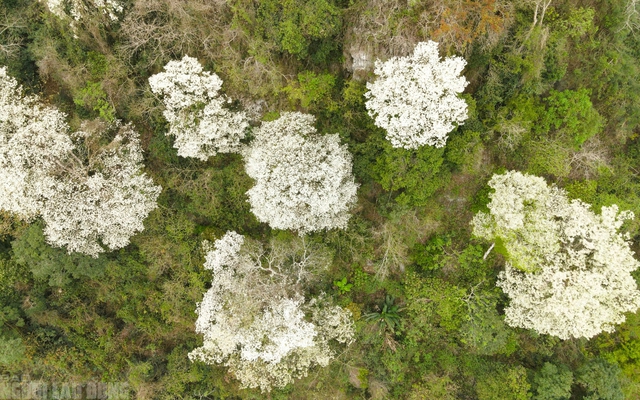 Nhìn từ trên cao, những cây thàn mát nở trắng tựa như những đám mây khổng lồ nổi bật giữa màu xanh bạt ngàn của núi rừng