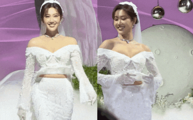 Mới đây, Thúy Ngân xuất hiện với vai trò người mẫu mở màn trình diễn váy cưới. Nữ diễn viên gây ấn tượng ngay từ khi bước ra sân khấu trong thiết kế đầm cưới bồng bềnh, khoe nhan sắc "thách thức" cam thường. Không chỉ sở hữu visual cuốn hút, điểm khiến Thuý Ngân nổi bật trên sàn diễn là nụ cười rạng rỡ và thần thái tự tin.