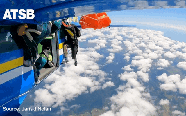 Đoạn video do Cục An toàn Giao thông vận tải Australia công bố cho thấy dù dự phòng của người tham gia đã được kích hoạt sau khi tay cầm của nó vướng vào cánh tà của máy bay. Người nhảy dù bị hất ngược ra sau – chân va vào thân máy bay – khi chiếc dù dự phòng màu cam quấn quanh đuôi máy bay.