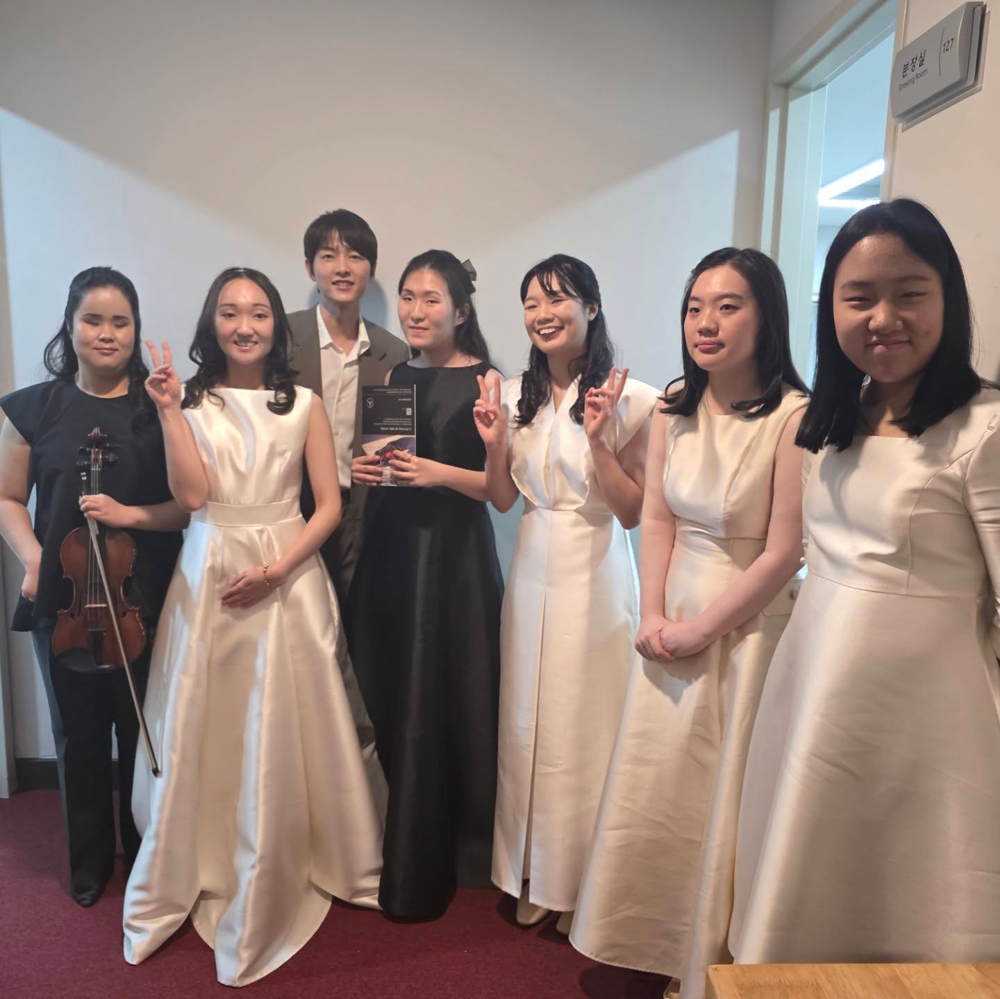 Vợ chồng tài tử thân thiện chụp ảnh với khách mời, thành viên dàn nhạc. Ảnh: Instagram