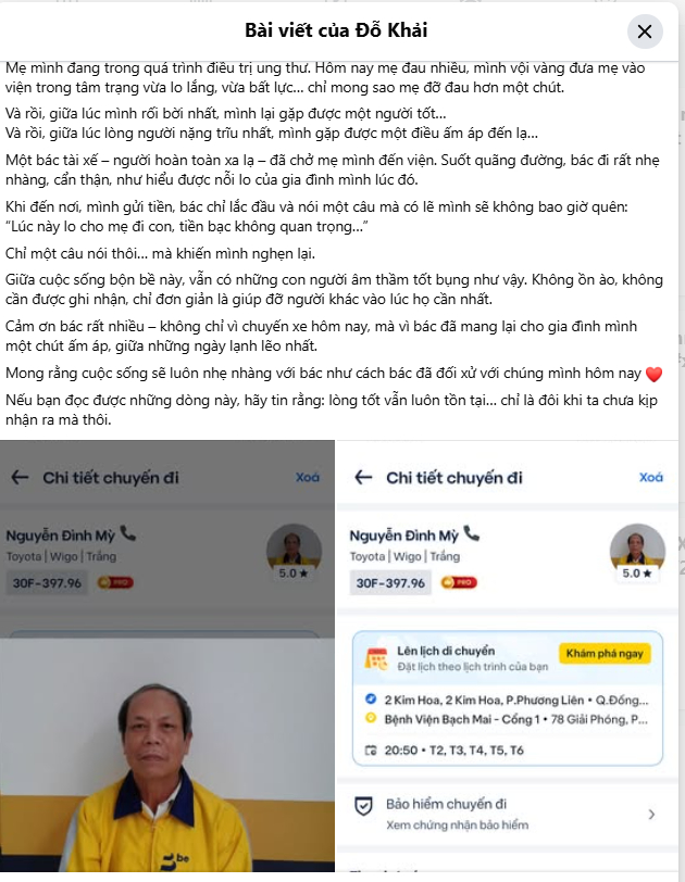 Mới đây, câu chuyện về chuyến xe đặt vội lúc gần 21h để đưa mẹ đi cấp cứu do một nam thanh niên chia sẻ đã nhanh chóng lan truyền trên mạng xã hội, khiến nhiều người không khỏi xúc động.