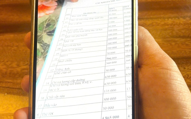 Trong đó, nhiều khoản phụ huynh cho rằng rất vô lý như; tiền chất tẩy 135.000 đồng/học sinh/năm; dọn vệ sinh 200.000 đồng/học sinh/năm; chi trả lương cấp dưỡng 630.000 đồng/học sinh/năm; chi trả lương bảo vệ, coi trưa, công tác quản lý 630.000 đồng/học sinh/năm học; vở luyện viết 60.000 đồng/học sinh/năm ...
