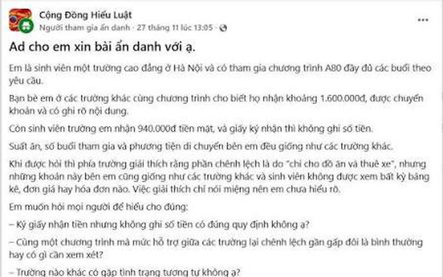 Trước đó, trên mạng xã hội, một số sinh viên đặt vấn đề tính hợp lệ của việc ký nhận mà không ghi rõ số tiền, cũng như thắc mắc vì sao cùng phục vụ chương trình A80 nhưng mức chi giữa các đơn vị lại vênh nhau đáng kể.