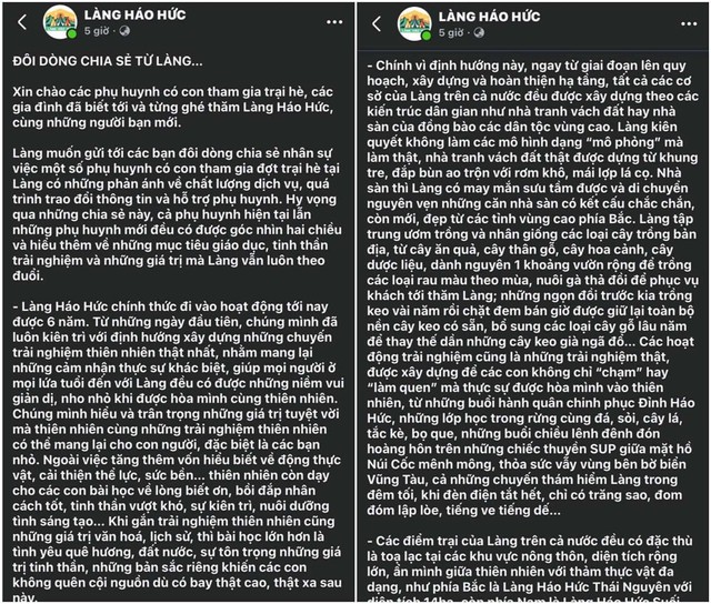 Tối 3/7, trên Fanpage Làng Háo Hức đã cập nhật bài đăng dài chia sẻ về ồn ào này. Ban tổ chức trại hè đã giải đáp các thắc mắc của phụ huynh liên quan đến khu vệ sinh, phòng tắm, an toàn vệ sinh thực phẩm…
