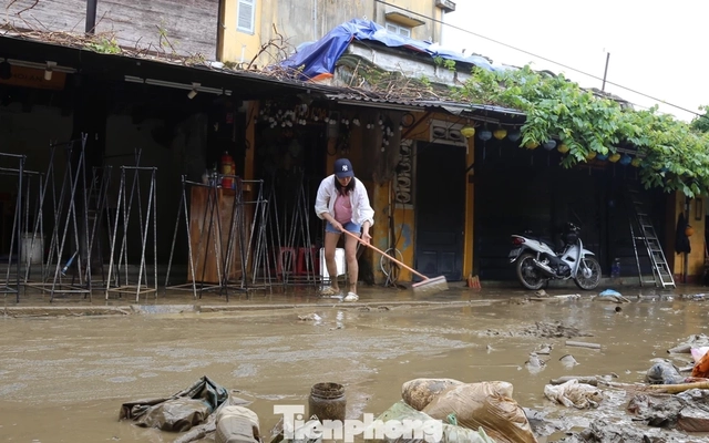 Lũ lớn những ngày qua khiến lượng rác và bùn non đọng đầy phố cổ, người dân mất rất nhiều thời gian, công sức để dọn dẹp
