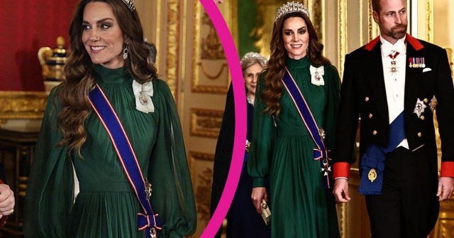 Từng món phụ kiện nhỏ nhất như chiếc xắc tay tinh xảo của nhà thiết kế Jenny Packham, cho đến dải băng GCVO Star và huy chương Royal Family Order của Vua Charles III đeo trang trọng trên ngực áo, tất cả đều được tính toán kỹ lưỡng để tạo nên một tổng thể không thể hoàn hảo hơn. Sánh bước bên cạnh phu quân là Thân vương William - người cũng vô cùng bảnh bao trong bộ trang phục đuôi tôm đen thắt nơ trắng cùng dải huân chương cao quý – Kate luôn nở nụ cười rạng rỡ. Cùng với Vua Charles và Vương hậu Camilla, cô đã thể hiện phong thái hiếu khách tuyệt vời khi nồng hậu đón tiếp ngài Tổng thống Bola Ahmed Tinubu.