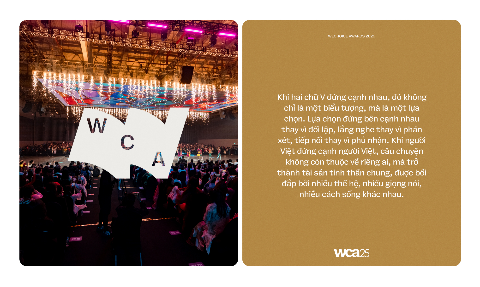 Khi V đứng cạnh V, một "chúng ta" được hình thành. Không phải một tập thể đồng nhất, mà là một cộng đồng đa dạng, nơi mỗi thế hệ giữ vai trò riêng trong cùng một câu chuyện. Đó là tinh thần của WeChoice: Không tách rời quá khứ khỏi hiện tại, không đặt tương lai đối lập với truyền thống, mà để tất cả cùng hiện diện trong một biểu tượng giản dị nhưng giàu ý nghĩa. Một chữ W được đọc bằng tiếng Việt, và được hiểu bằng tinh thần Việt - như một lời khẳng định rằng câu chuyện này luôn được viết từ bên trong, bởi những con người đứng cạnh nhau qua nhiều thế hệ.