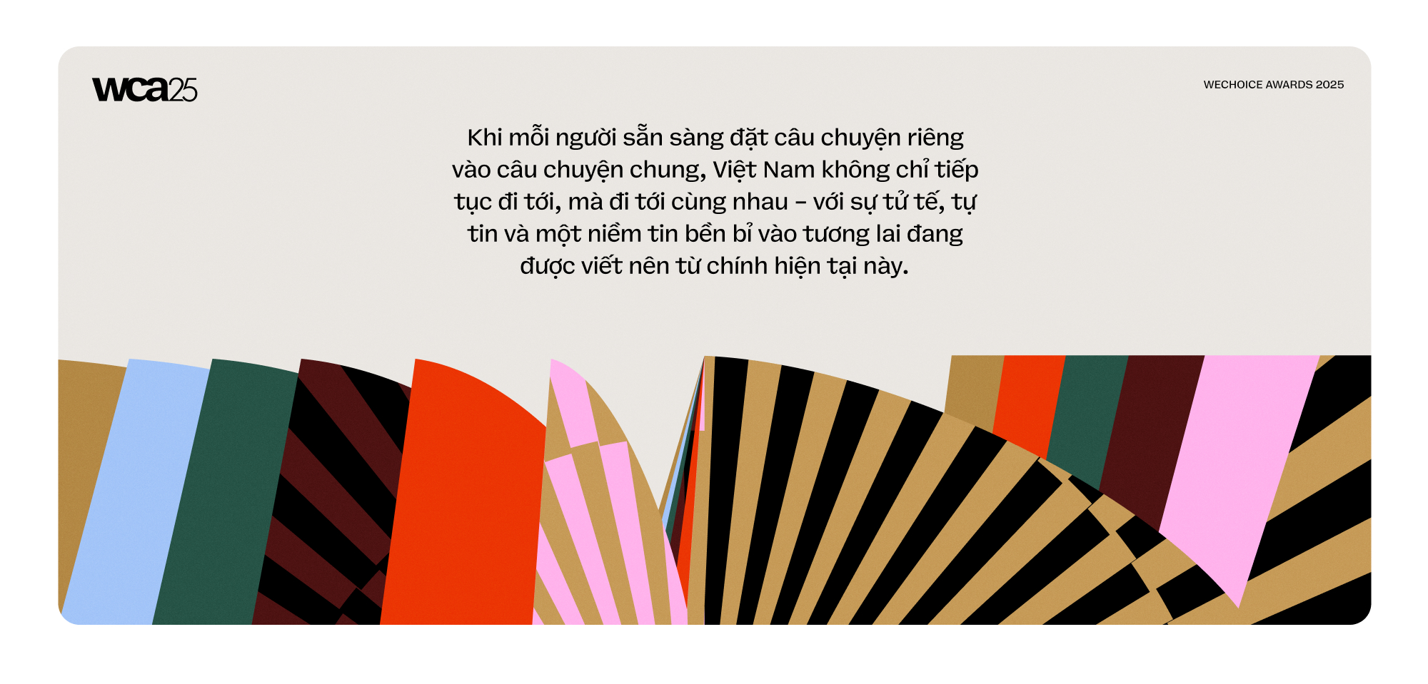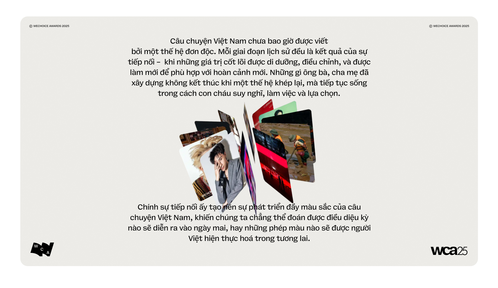 Tinh thần biết ơn, trân trọng và tiếp nối những giá trị di sản của thế hệ đi trước chưa bao giờ ngừng mãnh liệt trong trái tim người Việt. Năm qua, chúng ta đã thấy ngọn lửa ấy được thổi bùng lên qua những cảm xúc xuyên suốt của đại lễ A50, A80, trong sự lan tỏa của ca khúc "Viết Tiếp Câu Chuyện Hòa Bình" của nhạc sĩ Nguyễn Văn Chung. Cứ thế, mọi thế hệ người Việt đều mang ý thức mạnh mẽ về việc viết tiếp câu chuyện đầy tự hào của cha ông - theo cách của riêng mình. Với sứ mệnh kết nối và lan tỏa những nguồn cảm hứng đẹp nhất đó, WeChoice Awards 2025 lựa chọn thông điệp "Viết Tiếp Câu Chuyện Việt Nam", để cùng chính thế hệ người Việt ngày hôm nay, viết tiếp câu chuyện của đất nước mình cho tương lai.