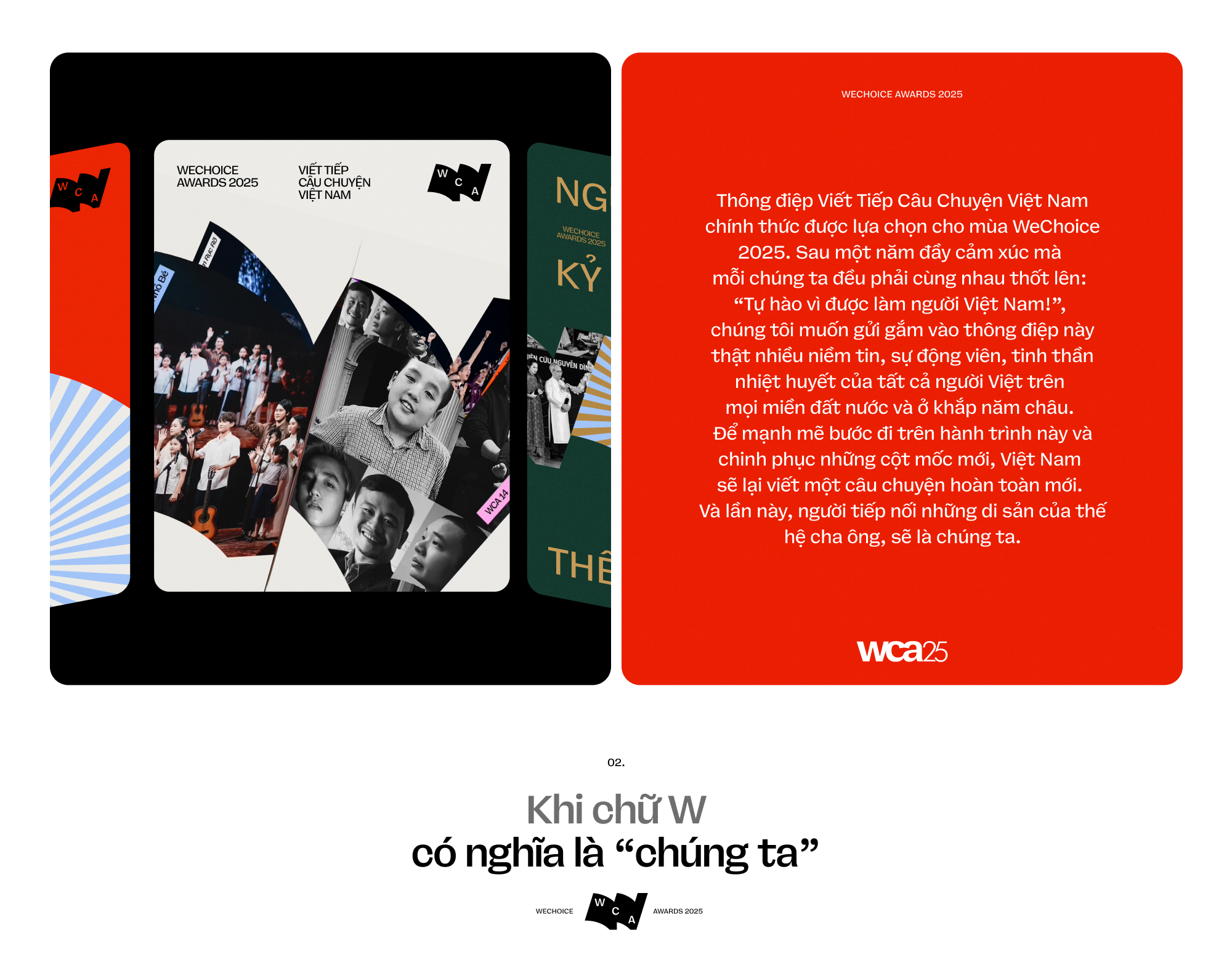 Chính từ tinh thần đó, thông điệp Viết Tiếp Câu Chuyện Việt Nam chính thức được lựa chọn cho mùa WeChoice 2025. Sau một năm đầy cảm xúc mà mỗi chúng ta đều phải cùng nhau thốt lên: "Tự hào vì được làm người Việt Nam!", chúng tôi muốn gửi gắm vào thông điệp này thật nhiều niềm tin, sự động viên, tinh thần nhiệt huyết của tất cả người Việt trên mọi miền đất nước và ở khắp năm châu. Để mạnh mẽ bước đi trên hành trình này và chinh phục những cột mốc mới, Việt Nam sẽ lại viết một câu chuyện hoàn toàn mới. Và lần này, người tiếp nối những di sản của thế hệ cha ông, sẽ là chúng ta.