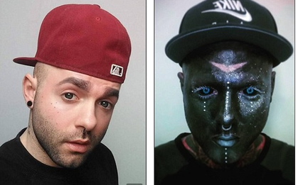 Adam Curlykale, một anh chàng hiện đang sống tại London, Anh Quốc đã "tô" kín hết 90% cơ thể của mình bằng mực xăm, trong đó bao gồm cả gương mặt lẫn tròng mắt.