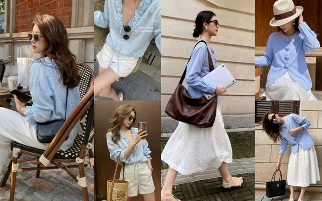 Nếu muốn thoải mái hơn, bạn có thể chuyển sang combo áo sơ mi xanh + quần short trắng. Đây là kiểu phối rất “city girl” – vừa mát mẻ, vừa giữ được nét chỉn chu. Những chi tiết nhỏ như kính râm, túi da nâu hay dây chuyền mảnh chính là “chìa khóa” giúp set đồ trông có điểm nhấn mà không cần quá nhiều lớp.