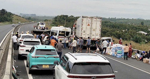 Vụ va chạm đã khiến dòng ô tô từ TPHCM đi các tỉnh, thành miền Trung ùn ứ kéo dài, đoạn từ trạm thu phí đầu tuyến cao tốc Phan Thiết - Dầu Giây đến nút giao Quốc lộ 56.
