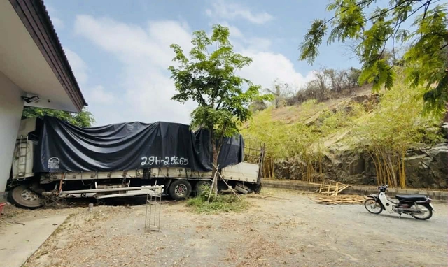 Chiếc xe rơi xuống ngay cạnh khu nhà ăn của công nhân một công ty khai thác đá dưới chân núi, hư hỏng nặng.