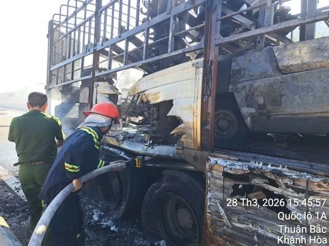 Nhận tin báo, lực lượng Cảnh sát Phòng cháy, chữa cháy và Cứu nạn, cứu hộ, Công an tỉnh Khánh Hòa đã điều một xe chữa cháy, một xe bồn cùng 8 cán bộ, chiến sĩ đến hiện trường, phối hợp các đơn vị liên quan dập lửa. Đến khoảng 15h30, đám cháy được khống chế hoàn toàn, tuy nhiên nhiều hàng hóa trên xe đã bị thiêu rụi.