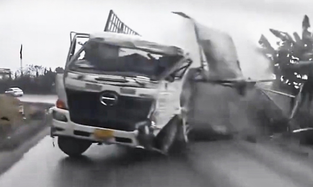 Việc chuyển hướng đột ngột khiến xe tải va chạm với một xe tải khác đang đi cùng chiều, đẩy phương tiện này xuống rãnh thoát nước và va vào taluy dương.