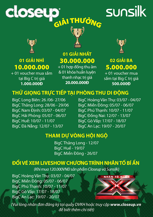 Sau hơn một tháng tranh tài vô cùng gây cấn và quyết liệt (từ ngày 15/6 – 20/7) của hàng ngàn thí sinh khắp cả nước, vào tối ngày 02/8, vòng Chung kết cuộc thi “Nhân Tố Bí Ẩn Big C” do nhãn hàng Close Up tổ chức chính thức được diễn ra.