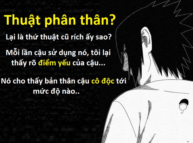 Câu nói này thực sự đã khiến các fan đọc truyện Naruto phải lặng mình khi nghĩ về nỗi đau của Sasuke, dẫu biết ngay từ đầu bộ truyện, tác giả đã sớm vạch nên cho cậu con đường đi của một nhân vật phản diện, một nhân vật có mối quan hệ đối nghịch hoàn toàn với Naruto.