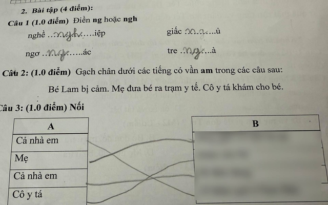 Nhìn bài tập tiếng Việt của con gái học tiểu học, một bà mẹ ở Đà Nẵng vừa buồn cười vừa… muốn xỉu. Bài yêu cầu nối các vế câu cho đúng nghĩa. Những lựa chọn tưởng đơn giản ai dè lại đẩy cả nhà vào tình huống dở khóc dở cười.