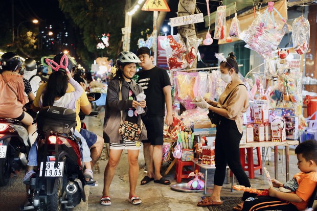 Các hộ dân bên đường cũng tranh thủ bán những đồ trang trí, tai đeo cho khách đến vui chơi, ai nấy đều vui vẻ, hào hứng