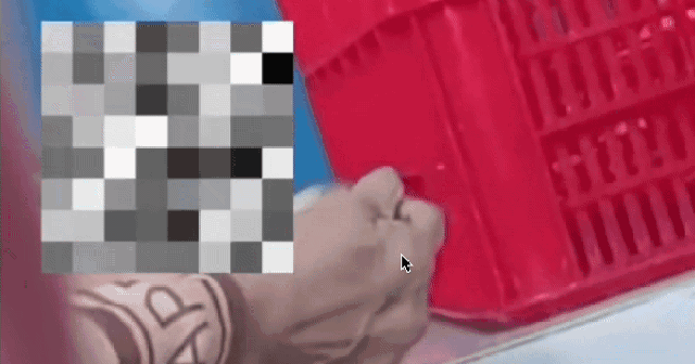 Bảo mẫu 1 tay nắm đầu trẻ ngửa lên, tay còn lại liên tục đổ đồ ăn vào miệng. Ảnh cắt từ clip