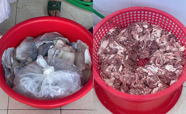 Thịt ôi thiu, cá ươn được phát hiện trong bếp ăn của Trường Tiểu học Chu Minh. (Ảnh: Dân Việt)