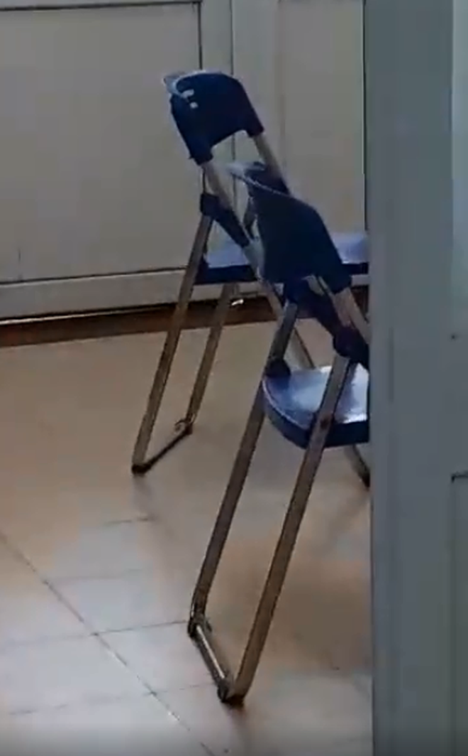 Ghế phía trong phòng khám còn trống, còn phía ngoài thì ánh mắt bệnh nhân hướng vào trong chờ bác sĩ gọi đến lượt. Ảnh cắt từ clip