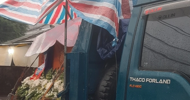 Tại đây, quan tài được đặt tạm trên xe tải, phủ bạt che mưa, xung quanh nước ngập gần nửa bánh xe . Gia quyến chỉ còn biết chờ nước rút để tiếp tục lo hậu sự cho người đã khuất.