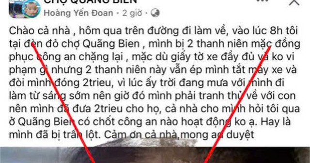 Trước đó, Công an xã Trảng Bom phát hiện bài viết trên nhóm “Chợ Quảng Biên” từ tài khoản Facebook “Hoàng Yến Đoan” đăng tải nội dung về việc bị 2 thanh niên mặc đồng phục công an chặn xe, tịch thu 2 triệu đồng không rõ nguyên nhân. Bài viết nhận được nhiều lượt tương tác, gây hoang mang, ảnh hưởng xấu đến dư luận tại địa phương.