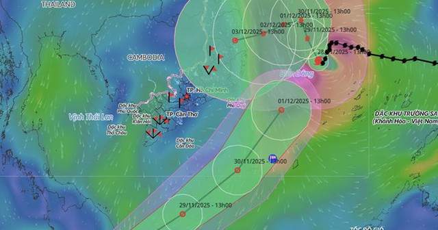 Dự báo hướng di chuyển của bão số 15, áp thấp nhiệt đới sắp vào Nam Biển Đông lúc 13 giờ ngày 28-11. Ảnh: Hệ thống giám sát thiên tai Việt Nam