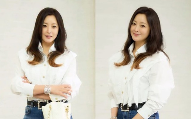Chiếc áo sơ mi cổ điển được nhấn nhá bằng cúc vàng ánh kim ở phần cổ và tay áo, tạo cảm giác vừa trang nhã vừa đắt giá. Kim Hee Sun khéo léo phối thêm thắt lưng đen đính ngọc trai, nhấn vào vòng eo thanh mảnh, tôn lên vóc dáng dù đã ở tuổi U50.