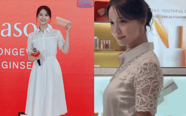 Yoona xuất hiện với chiếc váy midi dáng sơ mi phối ren ở phần tay và chi tiết thắt lưng cùng tone trắng. Tuy nhiên, bộ váy quá an toàn, mang đậm chất công sở tới mức nhàm chán, thiếu đi sự nổi trội của một "main event".
